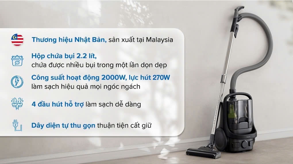 Máy hút bụi gia đình Panasonic này có công suất đầu vào 2.000W, công suất hút 270W giúp tạo ra lực hút mạnh mẽ để hút sạch mọi bụi bẩn nhanh chóng, dễ dàng.