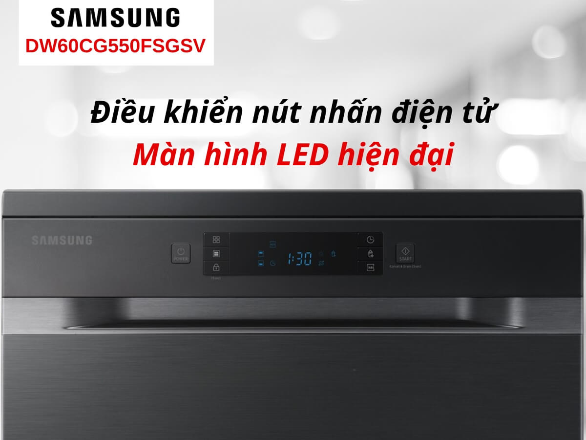 Máy rửa chén Samsung DW60CG550FSGSV được thiết kế với vẻ ngoài sang trọng và tinh tế, mang đến sự hiện đại cho không gian nhà bếp của bạn. Thân máy màu đen dễ kết hợp với mọi kiểu thiết kế nội thất bếp, đồng thời không bị gỉ sét và dễ lau chùi, vệ sinh. Đặc biệt, máy có thiết kế đứng độc lập, lắp đặt linh hoạt, cho phép bạn đặt ở bất kỳ vị trí nào trong nhà bếp mà không cần phụ thuộc vào tủ bếp.