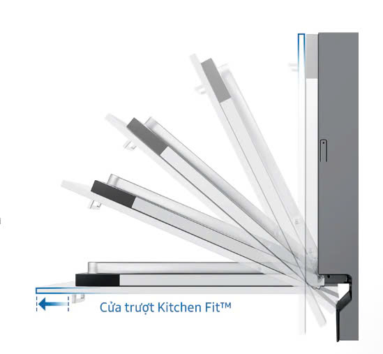 Cửa trượt Kitchen Fit™ với bản lề trượt cho phép nắp cửa trượt lên trên khi mở, nhờ đó cửa có thể mở hoàn toàn mà không bị cắt phần chân bên dưới.