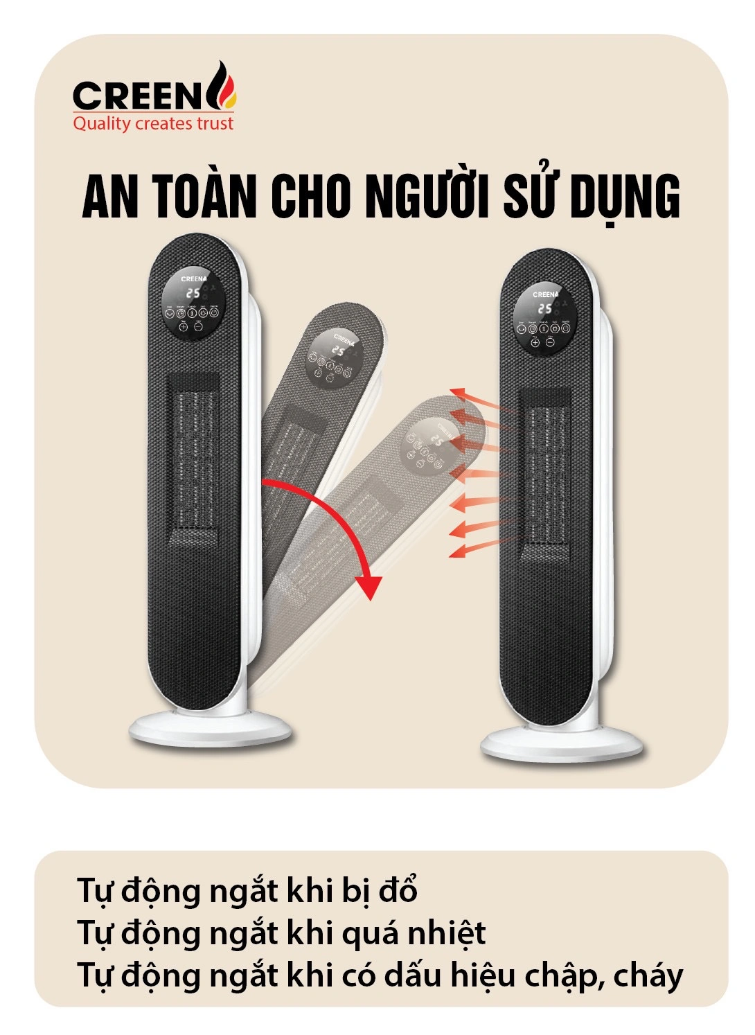 Nhờ công nghệ làm nóng các thanh gốm, nên quạt sưởi Creen không khô da, không đốt oxy, không bị cảm giác ngột ngạt khi đóng kín cửa phòng, phù hợp dùng cho trẻ sơ sinh, trẻ nhỏ và người già.