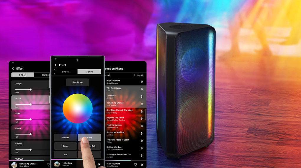 - Party Lights+ làm cho không khí sôi động với tính năng điều chỉnh chế độ ánh sáng đa dạng với nhiều âm điệu như: Party, Ambient, Dance, Thunder Bolt, Star và Lover. Chức năng này được sử dụng trên ứng dụng Sound Tower riêng biệt của loa.