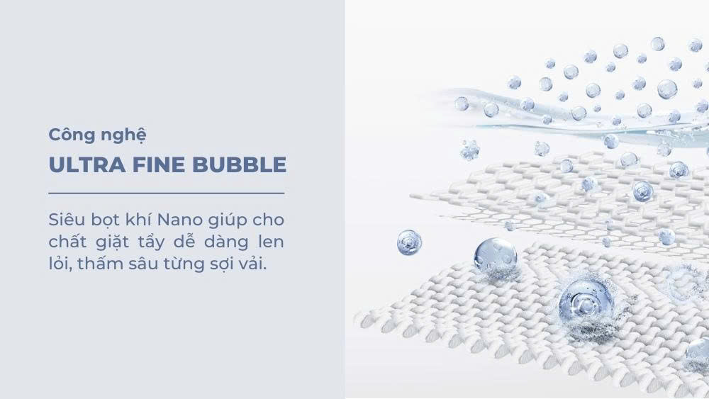 Công nghệ UFB tạo ra các bọt khí siêu nhỏ, giúp chất giặt tẩy thẩm thấu sâu vào từng sợi vải, loại bỏ các vết bẩn cứng đầu. Đồng thời, công nghệ này còn làm mềm sợi vải, giúp quần áo giữ được hương thơm lâu hơn và ngăn ngừa tình trạng kích ứng da do cặn bột giặt còn sót lại.