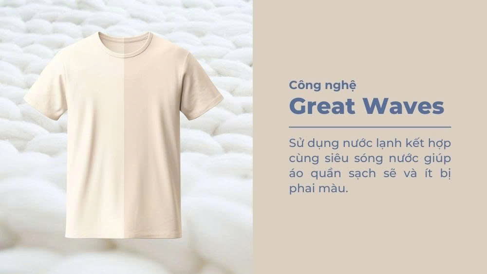 GreatWaves kết hợp giữa nước lạnh và sóng nước siêu mạnh giúp giặt sạch hiệu quả mà không làm phai màu quần áo. Ngoài ra, công nghệ này còn tiết kiệm năng lượng, duy trì độ mới cho quần áo trong thời gian dài.