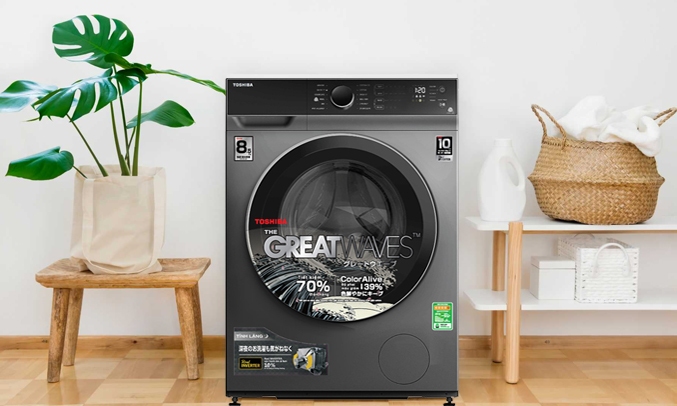 Máy giặt Toshiba Inverter 8.5 kg TW-BK95M4V(SK) - Máy giặt cửa trước có đường nét thiết kế tinh tế, gam màu xám bạc sang trọng giúp làm nổi bật không gian nội thất. Sở hữu nhiều công nghệ hiện đại như: công nghệ Inverter tiết kiệm điện, công nghệ Care Color giảm phai màu quần áo và Công nghệ Flush Waves đánh bay vết bẩn mạnh mẽ, chiếc máy giặt Toshiba là một trợ thủ đắc lực giúp giặt quần áo sạch tinh tươm. Nếu bạn đang tìm kiếm một chiếc máy giặt cho gia đình 3 - 5 người thì chiếc máy giặt có khối lượng có giặt 8.5 kg này là sựa lựa chọn thích hợp.