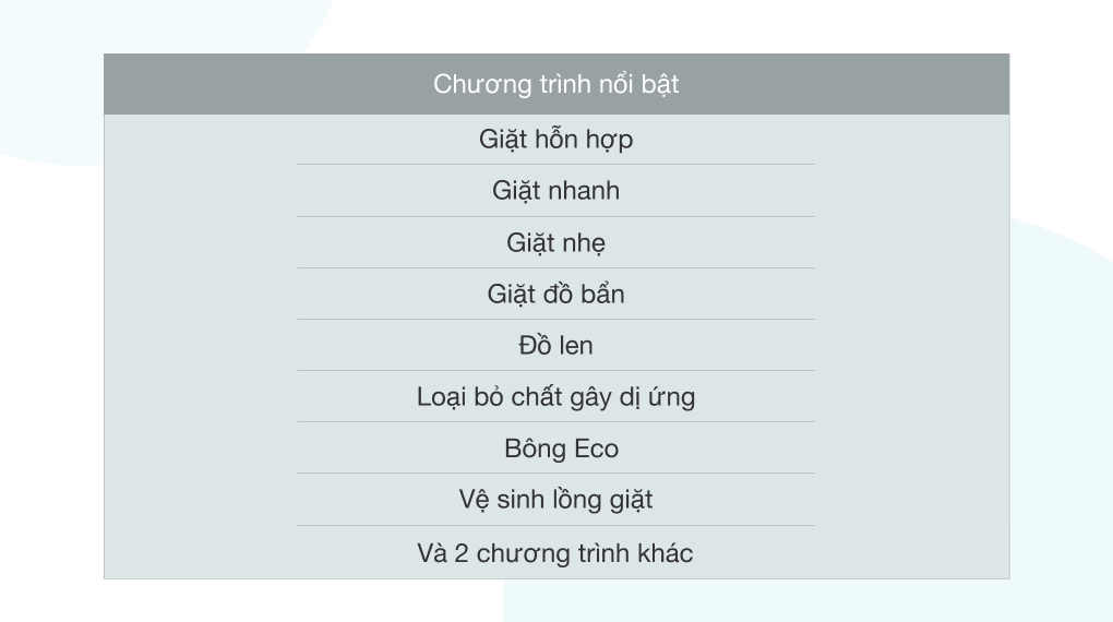 - Tích hợp 10 chương trình giặt tiện lợi phù hợp với chất liệu quần áo và mục đích giặt khác nhau: đồ len, giặt ngừa dị ứng, giặt nhanh, giặt tiết kiệm,… (xem thêm tại bảng thông số kỹ thuật). Chương trình giặt ngừa dị ứng giúp loại bỏ hiệu quả các chất gây dị ứng, đặc biệt an toàn với làn da trẻ nhỏ.