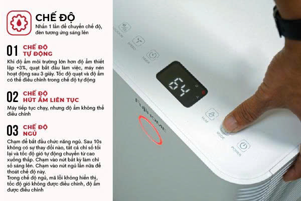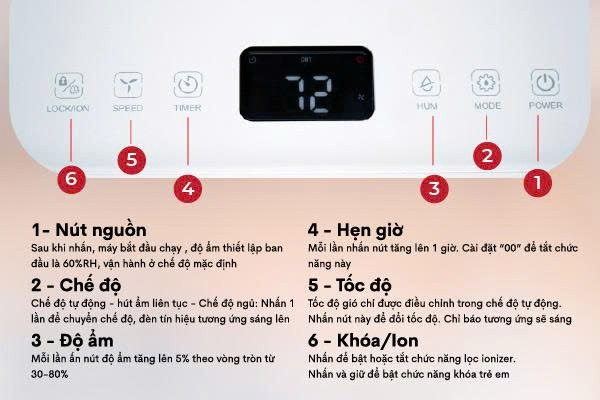 | Tiện ích: | Chế độ tự động Chế độ hút ẩm liên tục Chế độ ngủ Chức năng ionizer Hẹn giờ từ 1-24 giờ Khóa trẻ em Tự ngắt khi đầy bình |