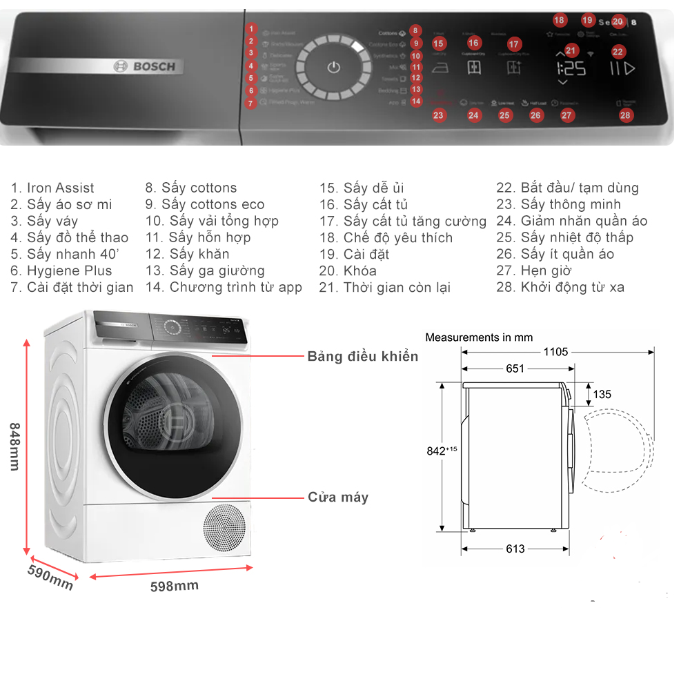 Máy sấy Bosch WQB245B40 có kích thước 842x598x613 mm (CxRxS) và trọng lượng 55,9kg