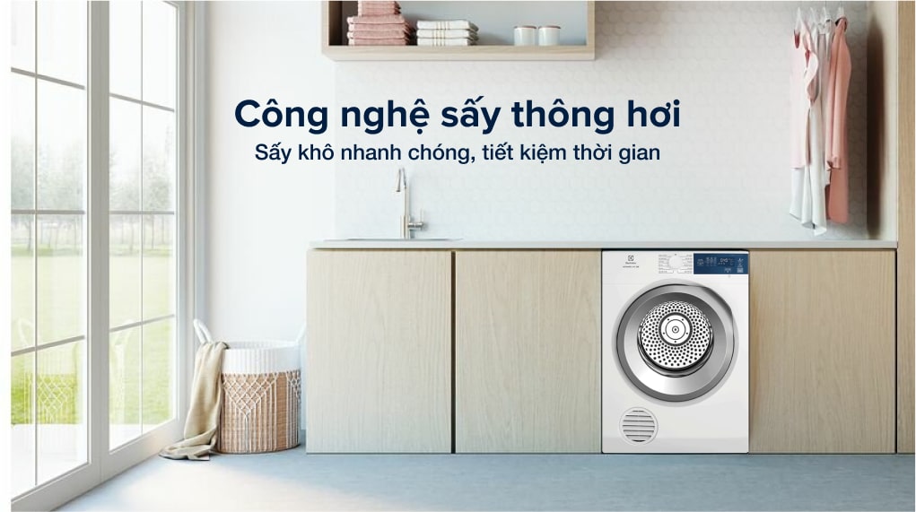 - Cơ chế: sấy thông hơi, sấy khô nhanh chóng, tiết kiệm thời gian. Bạn nên lắp đặt máy ở vị trí thoáng mát (gần cửa sổ) để luồng khí nóng ẩm được thoát ra ngoài.