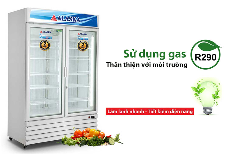 Tủ đông Alaska FC-100G2 có kiểu dáng hình khối đứng như 1 tủ mát 2 cánh kính trong suốt 3 lớp có sưởi kính, dàn lạnh đồng. Dung tích 1000 lít thoải mái bảo quản thực phẩm các loại sẽ lý tưởng cho các siêu thị, cửa hàng tiện lợi, căn tin, nhà hàng… Máy vận hành cực êm, không gây ồn. Tủ sử dụng gas R290, dàn lạnh đồng tiết kiệm 40% điện năng.