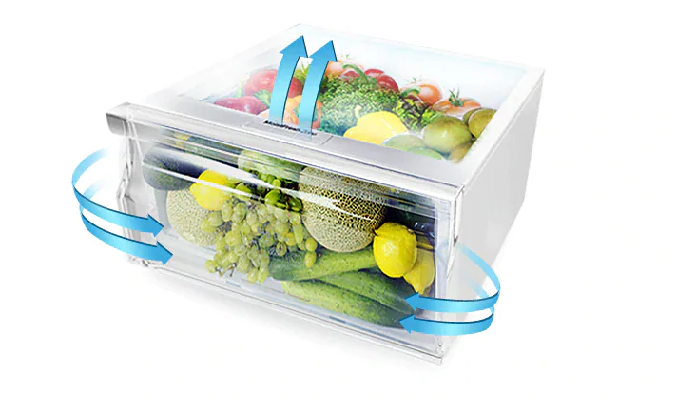 Tủ lạnh Samsung sỡ hữu ngăn giữ ẩm tối ưu kiểm soát lưu thông không khí nhắm duy trì độ ẩm tốt nhất, bảo quản hiệu quả thực phẩm tránh hư hỏng, thức ăn nhờ vậy mà tươi ngon lâu hơn. Ngoài ra, độ ẩm xuống quá thấp, ngăn giữ ẩm sẽ khóa lại, hạn chế hơi ẩm thoát ra.