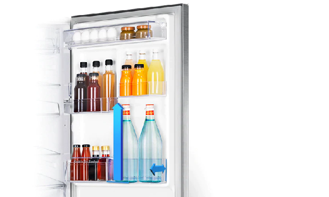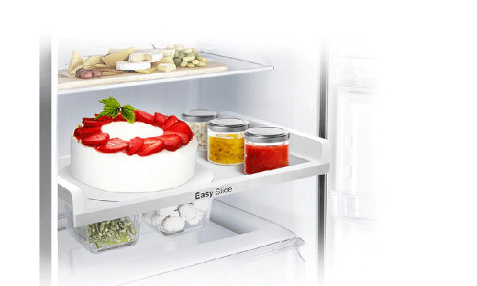 Tủ lạnh sở hữu Khay Kéo Linh Hoạt được đặt trên thanh trượt giúp người dùng kéo ra dễ dàng, thuận tiện lưu trữ, sắp xếp gọn gàng và lấy thức ăn nhanh chóng. Đồng thời, tiếp cận được thực phẩm ở sâu bên trong.