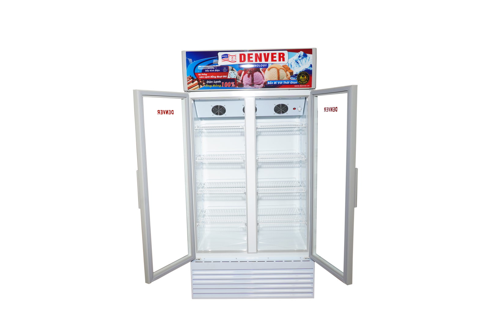 Tủ mát trưng bày có cửa kính hai lớp làm bằng chất liệu chịu lực, hệ thống sấy kính Low-E Film tiên tiến. Hệ thống đèn LED chiếu sáng dọc bên hông tủ.